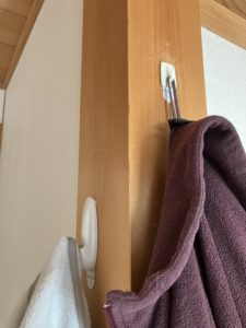 壁や柱に傷を付けたくないので、しっかり貼れてキレイに剥がせる「コマンドタブ」のフックを愛用。